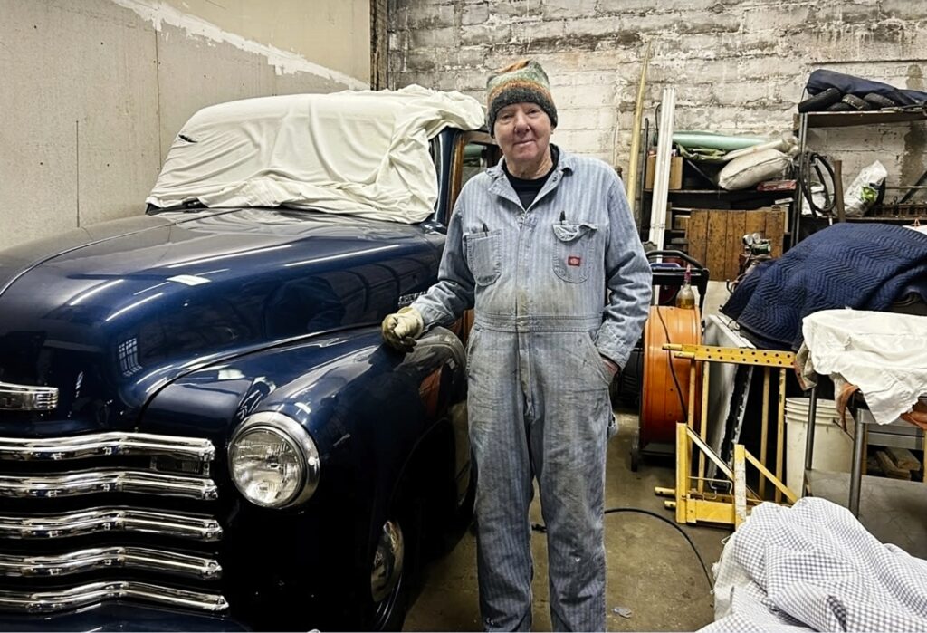 Carl “Tinker” West at his Highlands shop with his 1948 Chevy Woody Wagon which he