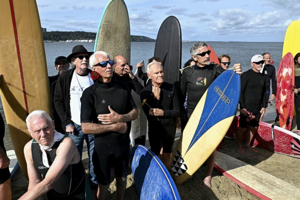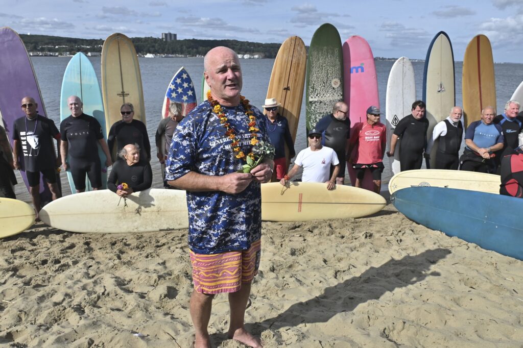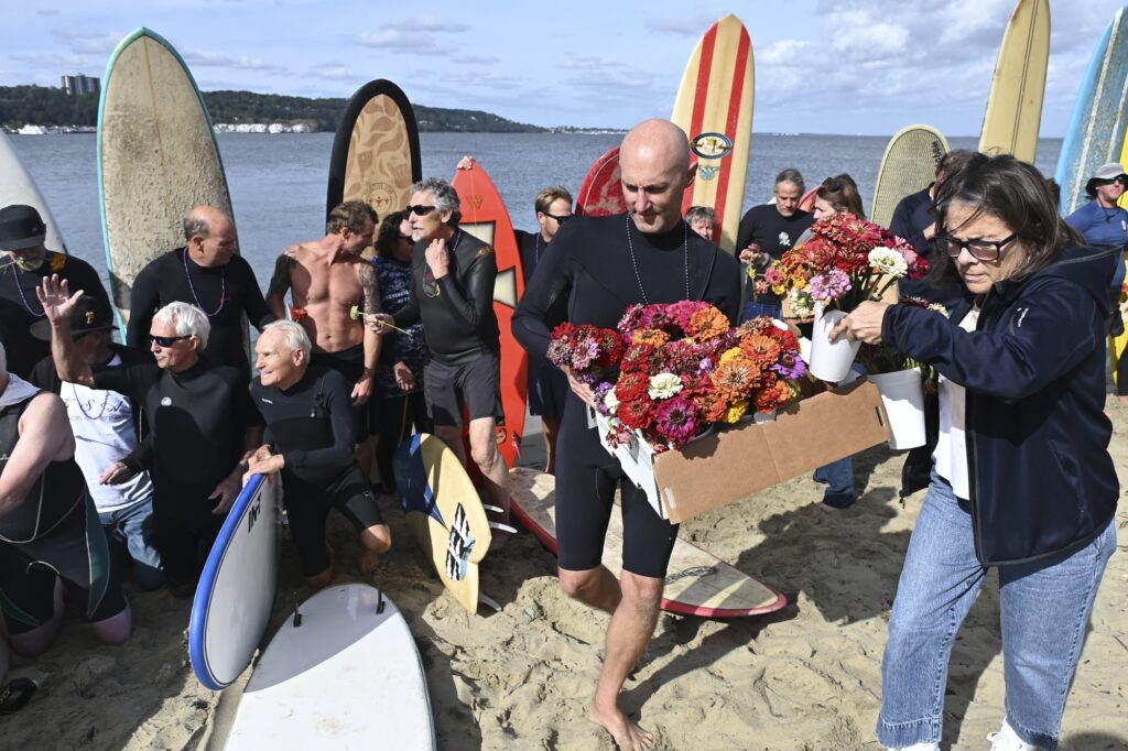 Surfers from around the region paddle out and saw some 150 friends of the legendary shaper in