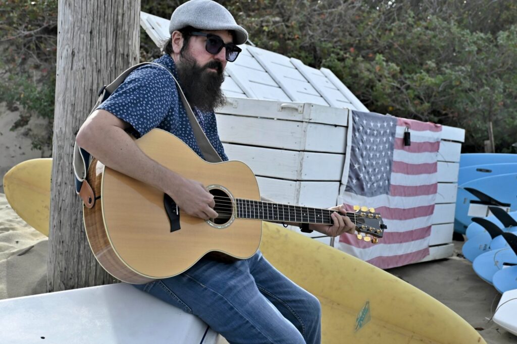 Rick Barry Jr of Church and State performs an original tune for Tinker at the Paddle Out. Photo: Mike Vuocolo @mikesshoreshots
