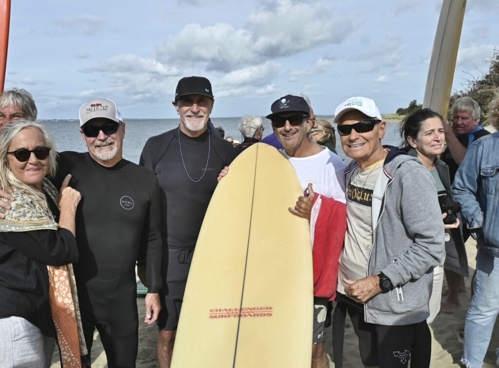 A passle of Jersey legends turned out for a legends legend including Mary Jo Pier, at left, with Gary Finnegan, Mike May, Mark Neustadter and Vince Troneic pictured with one of West’s boards. Photo: Mike Vuocolo @mikesshoreshots