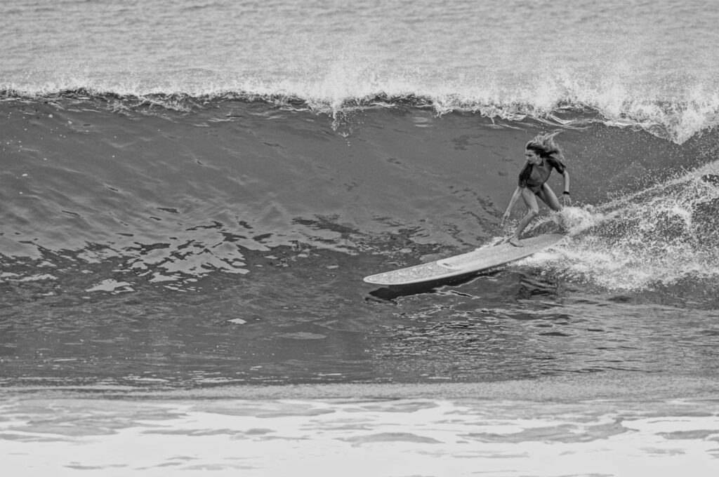 Second gen ‘Squan Charger, Jesse Duerr, daughter of Iong time Inlet kingpin – and recently selected to be inducted into the East Coast Surfing Hall Of Fame Scott Duerr – on a bomb. Photo: Bruce Chrisner