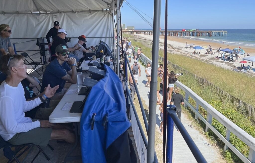 First day jitters at the contest. Judges and staff working things out as the surf fans start to arive Saturday morning. PHOTO : @tomduganphotos