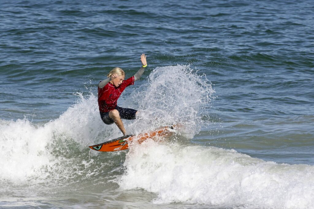 14 yr old Charles Moren drove up from Jupiter, Florida to surf the Jr. Men’s Pro. Charlie pushing off the lip and releasing a fin with a solid grom bucket on Saturday. PHOTO : @tomduganphotos