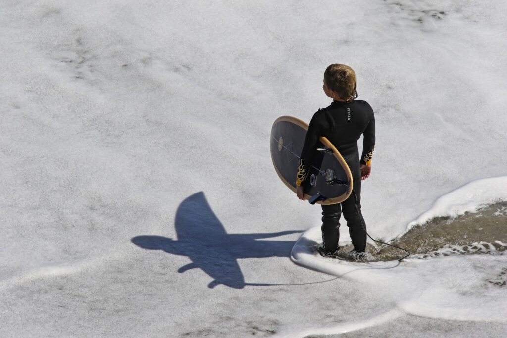 Every surfer pauses for a few minutes before they paddle out to check the waves and timing between sets. When you’re only eight years old and the waves are pushing over six feet you take a bit more time to plan your path out to the surf. Beau Behrens in deep concentration where the waves meet the shore. PHOTO : @tomduganphotos